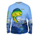 Cool and comfortable mens long sleeve performance tshirt. Sun protection 50+ UPF. Lab certified in Florida. Each print is done one at a time in our Sunny Miami location to your specific order. Enviro-Safe Water based Dye. 100% Interlock Polyester.
